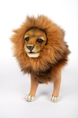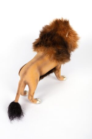 The Male Lion is a L28 cm x W11 cm x H19 cm, (11"x4.3"x7.4"), plush soft toy. He has been sewn from a mix of luxurious plush, to resemble that of his living counterpart. The male lion has a genuine realistic form and has been crafted from two velvety-smooth auburn-tan and white close-piles, with a semi-fluffy, dark brown-tipped, brown mid-pile for his under carriage, a fluffy black for his tail and for that magnificent tonal mane of his, a dense and fluffy auburn long-pile, fading into a dark brown-tipped, brown. His glossy, two-tone brown safety eyes, glimmer above his moulded feline nose and acrylic whiskers, whilst carefully applied hand shading and painting, has been meticulously activated in recreating his royal face and muscular torso, for that true-to-life appeal. All of this and he is wonderfully soft and cuddly, with a delightfully tactile touch.