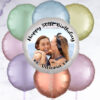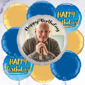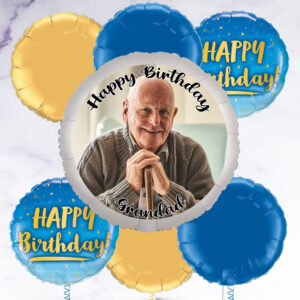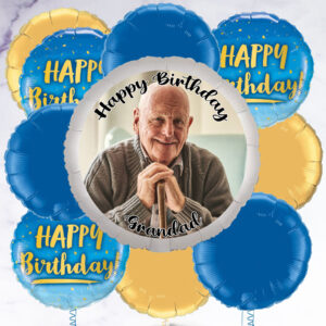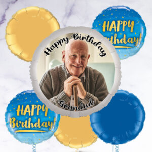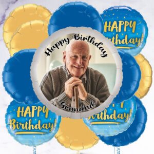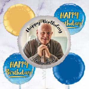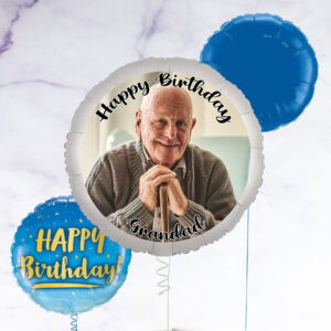 Our personalised photo balloon is a great gift for someone’s birthday, with the option to add a selection of blue, gold and ‘Happy Birthday’ foil balloons to make a fantastic bunch. Arriving inflated, you can add a photo of your choice to the balloon, as well as a personalised message. Photo balloon is 23″ in diameter, Foil balloons are 18″ – 20″ in diameter, Balloons arrived inflated with a weight, Float time: Approx 10 – 14 days, Note: If you order 4 or more balloons, your order may arrive in multiple boxes, How It Works Upload your image. Choose an image that’s as big as possible – this will allow you to choose the right part of your image to feature on the balloon., Use your mouse (computer) or finger (mobile/tablet) to move the balloon over your image in the preview above. Use the arrows to zoom in and out until you’re happy with your selection., Add your text – we can add one line of text at the top and one line of text at the bottom, or you can choose to have no text at all., Use the ‘Click here to see a preview’ button to see what your finished balloon will look like., On the next stage you can choose to add between 1 – 11 foil balloons to create a bunch.,