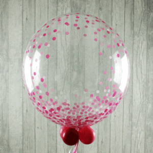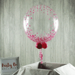 Help someone celebrate their birthday in style with this pink confetti-print bubble balloon. Ready to float out of the box on arrival, the lovely print at the bottom is complimented by the carefully attached tail at the bottom and your own special wording. We inflate the 24″ bubble balloon, add balloons to the base along with the tail, along with the personalisation of your choice. The balloon is then inflated, boxed and delivered on a day of your choosing during the checkout process. This is a long lasting balloon, expect a 2-3 week float time.