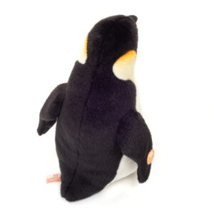 A soft toy standing penguin made by Hermann Originals in Germany. He is made with a silky soft black plush for the body with white markings that are lightly airbrushed with orange at the neck.