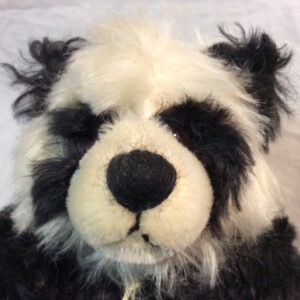 Little Paul is a 23 cm / 9", fully jointed panda. He has been sewn from a mix of luxuriously dense and wavy, glossy black and antique white mohair, with warm, black velvet paws that feature his Limited Edition number embroidered in a white thread and is lovingly stuffed with excelsior His delightful facial features include, two-tone brown, glass eyes, above a short-pile mohair muzzle with a bold, embroidered black nose. To finish, he wears his green Hermann Spielwaren tag and numbered certificate of authenticity.