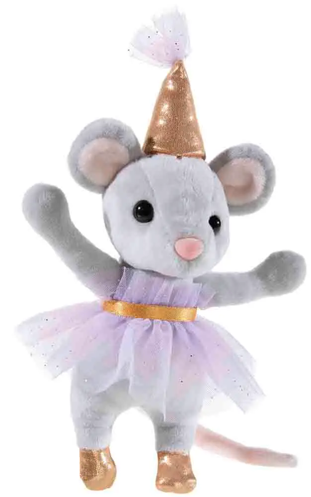 Let the celebrations begin with this delightful Party Mouse! As soon as the music starts, she’s ready to dance, bringing joyful energy wherever she goes. Dressed to impress in a pretty purple tulle dress, with a shimmering gold party hat and matching shoes, she’s always in the mood for fun.
