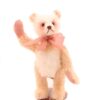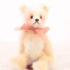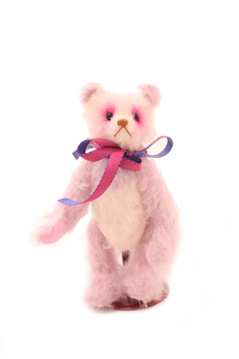 The panda is a fully jointed panda teddy, who has been sewn from a luxurious, mix of shaggy, sparse white and baby-pink mohair, with velvety-smooth pink paws, glossy black safety eyes and hand stitched chestnut features, not forgetting her striking, hot pink blushed panda 'eye tears', ensuring her adorable individuality. She has been lovingly stuffed with firm limbs and head, whilst her torso is part-bean filled for weight and that wonderfully tactile, squidgy soft feel. To finish, she wears a decorative satin ribbon bow in purple and hot pink.