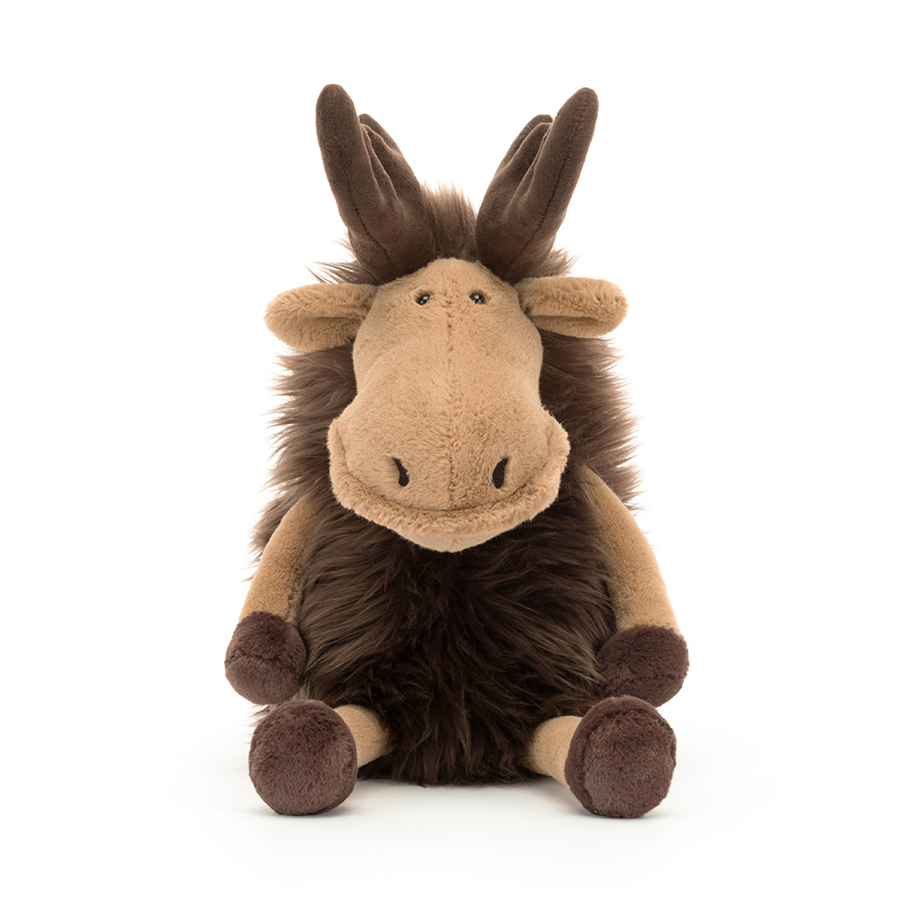 Chunky, quirky, and dreamy to hug, the Jellycat Merrick Moose is nosing ahead as a cuddle favourite! With a sitting height of 19cm, this gorgeous moose features a large almond coloured muzzle with a textured lip and a charming stitch-detail face, giving him a unique and lovable expression. A gentle giant with caramel limbs, Merrick is adorned with mighty cocoa antlers, soft brown shaggy fur, and beany hooves that make him irresistibly huggable. A stunning gift for wildlife fans, Jellycat Merrick Moose is sure to become a treasured companion.