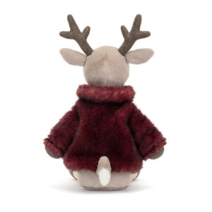 When Jellycat's Vivien Reindeer trots in, it's clear who runs the sleigh! She is a 46cm chic doe, with her almond-coloured fur, long stitch lashes, and elegant praline antlers, is ready to dazzle. Her sparkling mocha hooves add a touch of glam, while her textured berry coat, lined with satin, brings festive flair. The coat fastens with a ribbon and can be taken off when it's time for Vivien to strut her stuff. Perfectly poised and fashion-forward, Vivien Reindeer is the life of any holiday party!