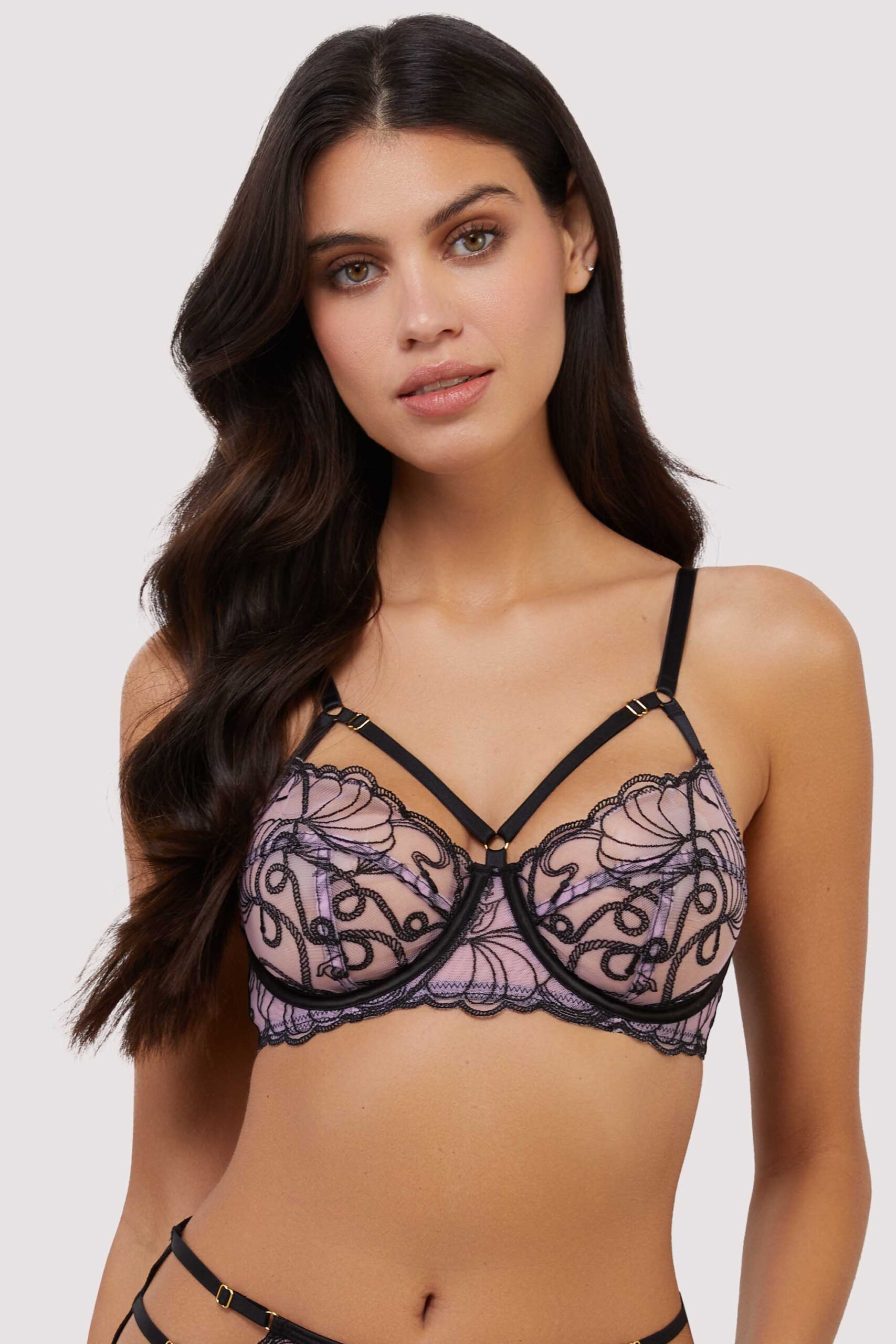 Indulge in a touch of naughty and nice with the Playful Promises ‘Jessie’ Pink and Black Whip Embroidery Balconette Bra – where sweet meets seduction! Racy black whip embroidery overlays pretty pink mesh; add a teasing harness detail and it makes the perfect choice for those who like to mix a little mischief with their lingerie. Embrace the allure, harness your confidence and let your playful side take centre stage!