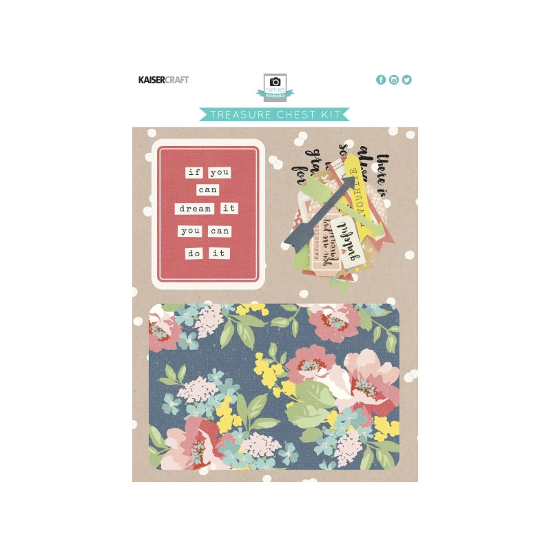 Kaisercraft Treasure Chest Captured Kit from World of Craft. Included in the package are thirty 3” x 4” captured moment cards (15 double sided designs), thirty 4” x 6” captured moments card (15 double sided designs); fifty collectibles, four 3” x 4” photo overlays and four 4” x 6” photo overlays.