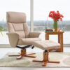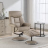 An excellent value swivel recliner chair upholstered in stunning fabric and leather match finishes. The Marseilles is a luxurious leather match or fabric recliner that will add a stylish touch to any living space. With its generous seat area and high back, it is able to comfortably accommodate individuals of all sizes and heights. Simply push back on the Marseilles and it will recline a considerable way, making it perfect for a quick afternoon nap. Colour Availability as of 03/12 Cafe Latte Low stock Grey In stock Bold design. Strong fabric or leather match. Smart construction. Great value leather match recliner Reclines back a considerable way Cherry-coloured star base Includes delivery and matching footstool Sloping footstool. Sturdy build. Ideal for resting. This great value recliner comes complete with a specially-designed sloping footstool, allowing you to rest your feet and legs at the optimum height. Both the chair and the footstool are upholstered in fabric or quality leather match and supported by an elegant, cherry-coloured base. 360-degree swivelling. True rotational freedom. Take it for a spin. This chair swivels a full 360 degrees, giving you complete flexibility. Features PU leather match or soft fabric Star spindle base Steel frame Manual recline Supports up to 18 stone Medium assembly required