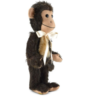 Milo Monkey is 23cm tall and fully jointed. He has been sewn from a luxurious, dark mohogany brown mohair with a cream tummy. He has wool felt paw pads, inner ears and face, which showcases those emotive, glossy eyes and embroided, lovable features to perfection. An authentic curl to his tail adds more charm, whilst a sumptuous, long tailed, satin ribbon bow adds the fun. Now let the mischief begin!