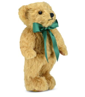 Shrewsbury is 10" /25cm tall and fully jointed and is sewn from a luxuriously soft and dense golden blonde mohair, with contrasting, warm wool felt paws, sincere glossy black eyes and a kissable, hand stitched nose. His delightful bean-filled tummy, is gorgeously squidgy soft, whilst his sumptuous, long tailed British Racing Green satin ribbon bow, adds that must-have classic touch. To finish, the Merrythought logo badge, is sewn onto his right paw. The same bear, with an exciting addition!!