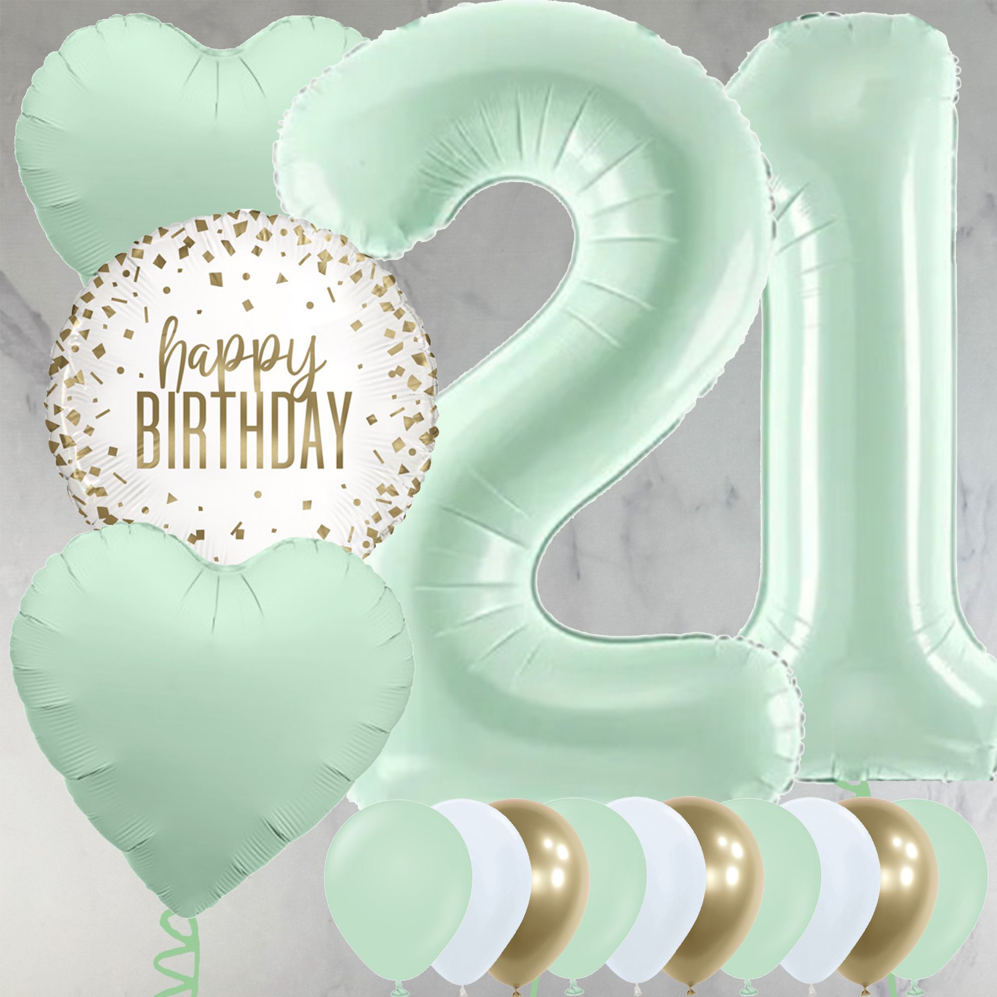 Great for any birthday party, anniversary celebration or special milestone, our mint green foil number balloon package is a lovely gift or perfect party decoration. Arriving inflated in the post, our mint green numbers balloon package can include 1 or 2 foil numbers depending on what you need. Alongside your foil number(s), the package includes our foil balloon bunch with a ‘Happy Birthday’ design. We add in 10 free scatter balloons to match the colour scheme.
