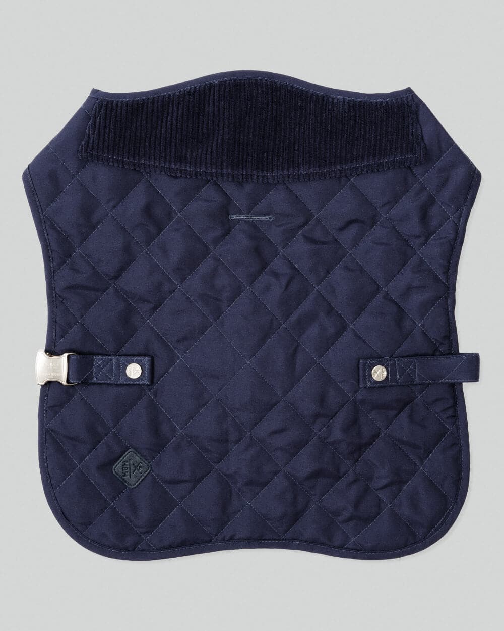 Hackett x Hugo & Hudson. Introducing this navy quilted dog jacket crafted from a soft blend of polyester that stands out for its striking corduroy collar, metal rivet detail, laser-engraved metal buckle, and soft fleece lining to keep your pet warm.