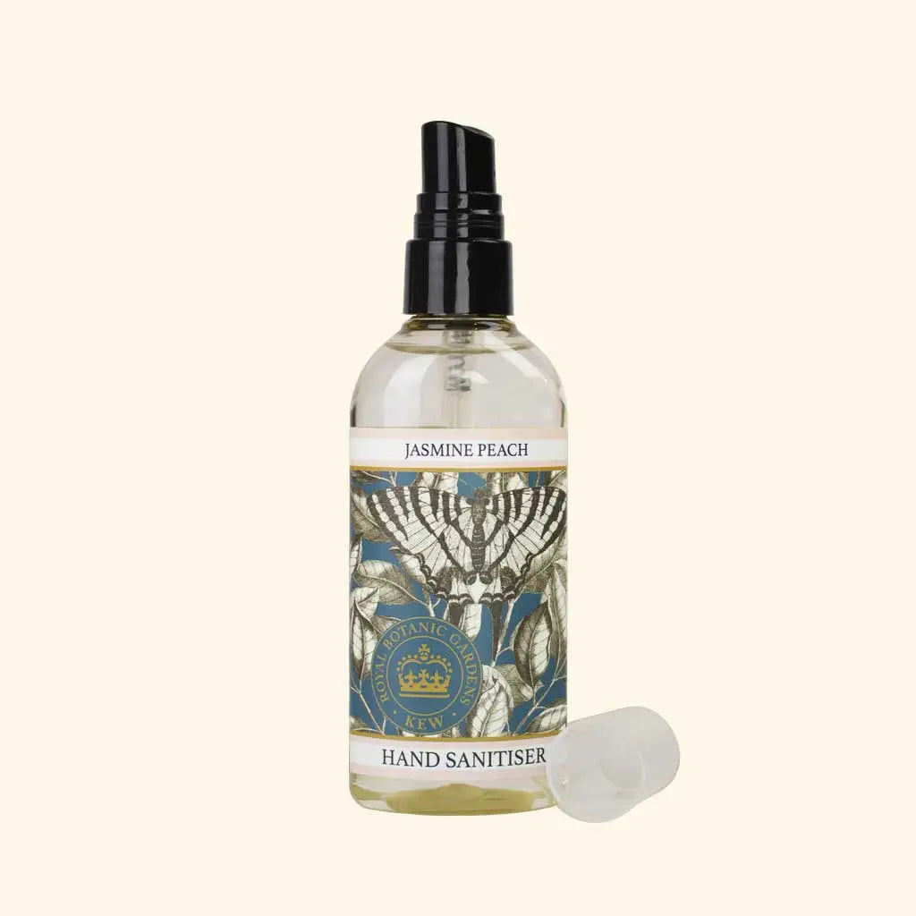 Nourishing & Radiant Jasmine Peach hand sanitiser, 75% alcohol, infused with aloe vera and vitamin E. Travel size 100ml, keeps hands soft and protected.
