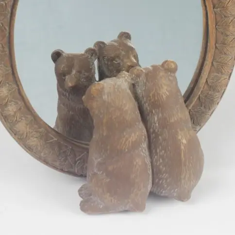 A delightful decorative mirror by Originals International featuring adorable bears incorporated into the frame design as they gaze into the mirror.