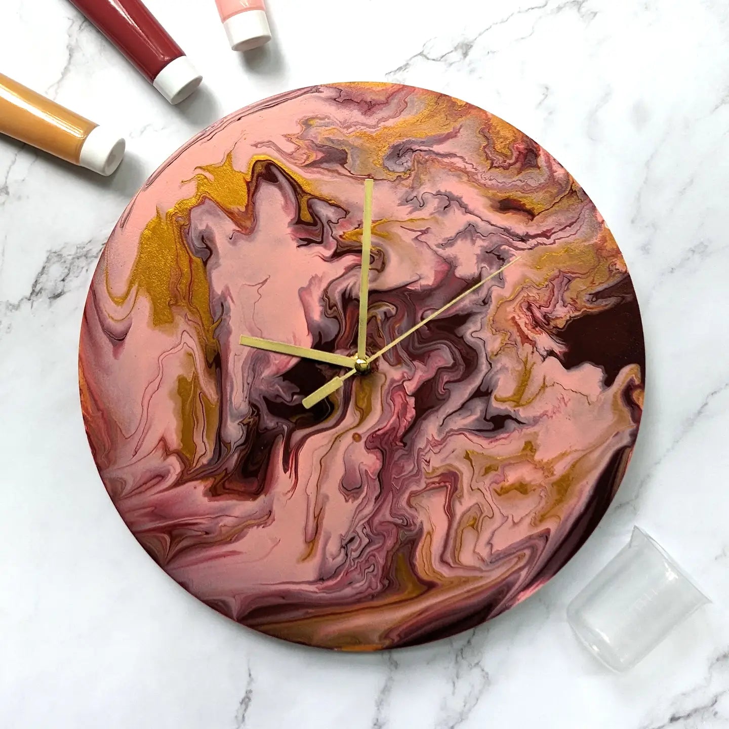 Paint Pouring Wall Clock lets you craft stylish clocks! Decorate with acrylic paints, add a golden mechanism, and enjoy your masterpiece. Perfect gift idea!
