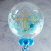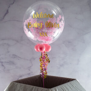 This stunning baby pink stars confetti bubble balloon is a lovely gift for special occasions, including baptisms, baby showers and even hen dos. We inflate a 20″ clear outer balloon and fill it with the star-shaped confetti. Then we add your personal message to the outside in a font and colour of your choosing. To finish, we add a collar of smaller balloons, along with ribbons and a weight.