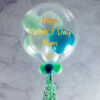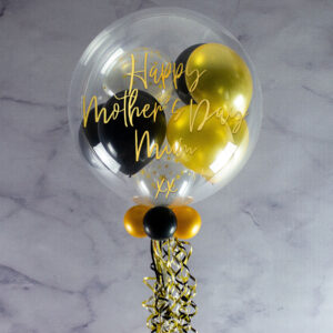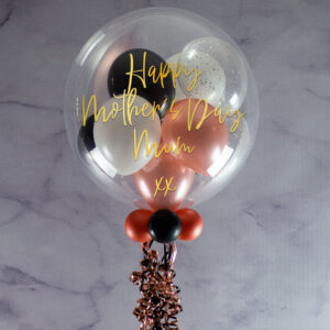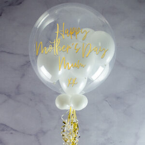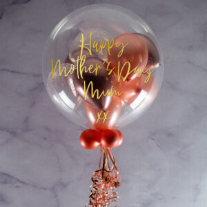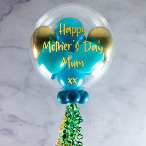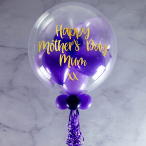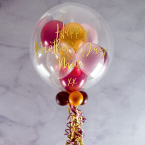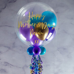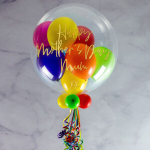 Show your Mum how much she means to you on Mother’s Day with this personalised bubble balloon decoration you can customise yourself, filled with a selection of small balloons in your choice of colour scheme. Perfect for displaying in your home and garden or a lavish party venue, you can even add a message to the outside design, making it an extra special gift to show how much you love her. We inflate a 20″ spherical clear plastic balloon and then insert your choice of colours inside, which are then inflated to create a wonderful effect. To finish we add four small balloons to the base of the balloon and add colour co-ordinated ribbons and a weight. The balloon is ready to float out of the box on Mother’s Day and will last, on average, between 7 – 10 days.