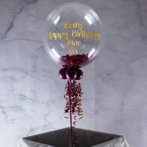 Add a hint of high-class colour to any occasion with this berry feathers bubble balloon. Creating a stunning effect as a decoration or a gift, this balloon can be personalised with any message you choose on the outside, with a choice of styles and colours. We inflate a 20″ clear outer balloon, then fill it with deep berry-coloured feathers. To finish, we add four small balloons to the base, along with a ribbon and weight. On average, these balloons will last between 7 – 10 days.