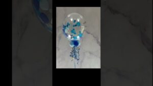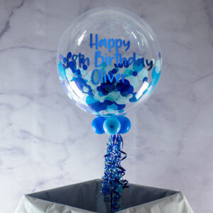 Decorate your party in style or send the perfect gift with this blue confetti filled bubble balloon. Sent fully inflated on a next day delivery service, our balloons arrived boxed and in perfect condition for any big occasion. The 20″ clear balloon is filled with blue confetti and then inflated, giving it a float time of between 7 – 10 days. You can add a personalised message with ease – just let us know your wording, what font you’d like and the colour you’d like it in. We finish each balloon with four smaller balloons at the base, and matching ribbons and a weight.