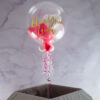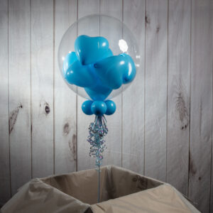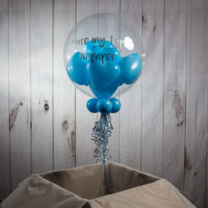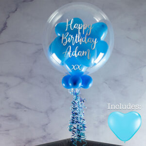 Give your other half a memorable gift on Valentine’s Day with this cool blue heart balloon-filled bubble balloon, personalised with your own wording. Make a lovely statement or surprise them with your gift when this balloon pops out the box. Our 20″ clear outer balloon is inflated, then filled with smaller heart-shaped balloons. On the outside you can add your message, with a choice of colours and fonts. We finish the look with smaller balloons around the base, matching ribbons and a weight. Lasting 7 – 10 days on average, this bubble balloon arrives boxed, inflated and ready to open.