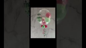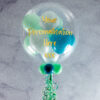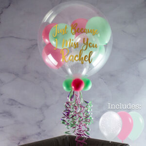 The colours in this bubble balloon reminded us of candyfloss, so that’s what we decided to call it! Sweet and sugary, it’s perfect for children’s birthday parties, summer events and other special occasions. We inflate a 20″ outer balloon, then fill it with rose pink, mint green and clear stars mini balloons. On the outside we add your chosen wording in the selected font and colour, finishing with matching ribbons and a weight. Lasting 7 – 10 days on average, this bubble balloon arrives in a box, inflated and ready to open.
