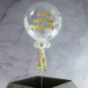 Our Personalised Christmas “Will You Marry Me?” Balloon is a unique and romantic Christmas wedding proposal idea to surprise that special someone. Pop the question with ‘will you marry me?’ text that will float gracefully out of the box, creating an unforgettable moment between you and your partner. You can personalise this decoration with a proposal question, a special message or unique wording of your choice. A wonderful decoration for the wintertime, festive parties and other Christmassy occasions. We inflate a 20″ spherical clear balloon and then insert your choice of white-themed filling. To finish we add 4 small balloons to the base of the balloon and add colour co-ordinated ribbons and weight. Each balloon lasts between 7 – 10 days, long lasting in comparison to standard foil balloons.