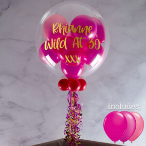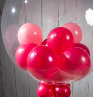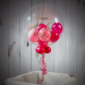 Looking for something that’s pretty in pink? Our beautiful bespoke bubble balloons are a lovely gift for any occasion and can be personalised just the way you want it! This dark pink themed balloon features an array of different shades to suit the party venue or theme you have in mind – from birthdays, christenings, weddings, and more. This design is a 20″ clear plastic balloon filled with a selection of small balloons in dark pink shades. You can personalise your balloon with a message or wording on the outside, as well as choosing your colour and font. We add smaller balloons to the base, along with ribbons and a weight as a finishing touch. The average float time of our balloons is 2 – 4 weeks.
