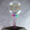 Celebrate a holiday of egg hunts, chocolate indulgences and seasonal traditions with the Personalised Easter Confetti Filled Bubble Balloon from Party On! Perfect for adding a colourful surprise to your Easter celebrations, this fantastic confetti filled bubble balloon is the perfect alternative gift for celebrating the Easter period. You can even personalise this decoration with a special message or Easter wording in a range of colours and fonts to choose from. We inflate a 20″ outer balloon, then fill it with multi coloured confetti. On the outside we add your chosen wording in the selected font and colour, finishing with matching ribbons and a weight. Lasting 7 – 10 days on average, this bubble balloon arrives in a box, inflated and ready to open.