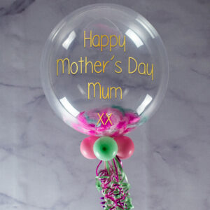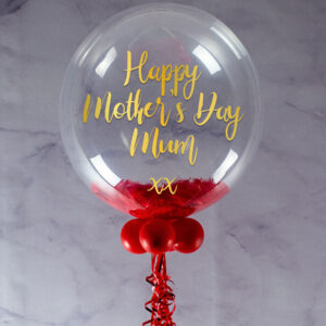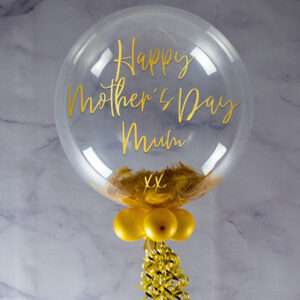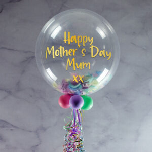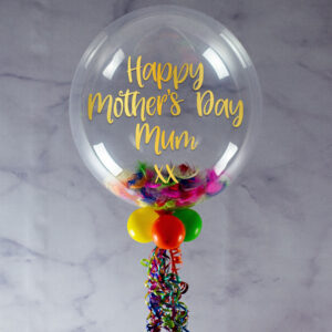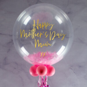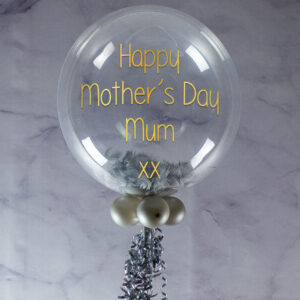 Show your Mum how much you appreciate her on Mother’s Day with one of our stunning feather filled bubble balloons, with a selection of fantastic feather colours to choose from. We inflate a 20″ clear outer balloon and then add your chosen fluffy feathers inside. On the outside, we can add a message of your choice to make this an extra personal gift for Mum. To finish, we add four smaller balloons to the base, along with colour co-ordinated ribbons and a weight. Ready to float out of the box and surprise her on Mother’s Day, our balloons last between 7 – 10 days on average.