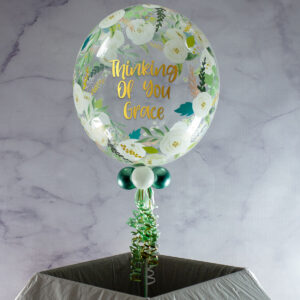 Our Floral Charm 24″ inflated bubble balloon is a beautiful option for those looking to send a thoughtful gift. The outside of the balloon is printed with a stunning floral design, making it great for Mother’s Day and a lovely decoration. To create this decoration, we inflate a 24″ balloon and finish the look off with a matching collar and ribbons. Lasting 7 – 10 days on average, this bubble balloon arrives boxed, inflated and ready to open.