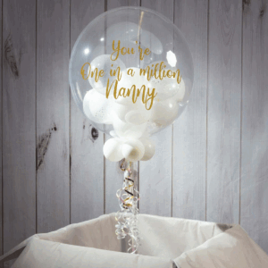 If your Nan is the one you want to celebrate and spoil on Mother’s Day, look no further than our special personalised bubble balloon. Inside the 20″ clear outer balloon, we add a selection of fantastic smaller balloons to create a unique and eye-catching look. On the outside we can add your special message to Nan, saying whatever you’d like in a choice of fonts and colours. To finish the look, we add smaller balloons to the base along with ribbons and a weight. We’ll send your balloon out in a tissue-lined box, ready to magically float out when opened.