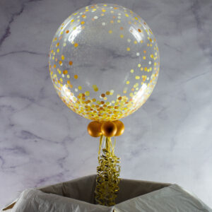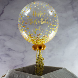 Nothing says “celebrate!” quite like our Personalised Gold ‘Confetti Print’ Bubble Balloon. Ready to pop up upon arrival, this balloon in a box comes with a luxurious print and can be customised with a unique message of your choosing. We inflate the 24″ bubble balloon, add balloons to the base along with the tail, along with the personalisation options of your choice. The balloon is then inflated, boxed and delivered on a day of your choosing during the checkout process. This is a long-lasting balloon, expect a 2-3 week float time.