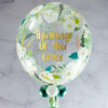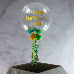 There’s something particularly cheery about our green, white and gold feather filled 20″ bubble balloon, making it perfect for all special occasions. Inside the clear outer balloon, we add fluffy feathers in the three colours, adding vibrancy to any celebration. To finish the look, we add four smaller matching balloons to the base along with ribbon and a weight. We expect these balloons to last approximately 7 – 10 days.