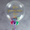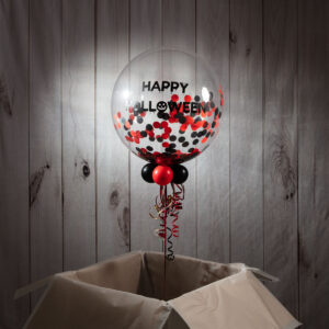 Be ready to spook your guests at Halloween with our amazing Personalised Halloween Confetti Bubble Balloon from Party On! This frighteningly designed balloon decoration is perfect for placing in any party venue, home or haunted house. This confetti bubble balloon can also be personalised with a special Halloween-themed message in our ghoulish text design and choice of colours. To create this balloon in a box, we inflate a clear outer balloon then fill it with dark red and black confetti. Then we add your personalised message to the outside in a spooky font! To finish the balloon, we add four small balloons to the base along with ribbons and a weight. Please Note: All wording will be in our special ‘Halloween-style’ font.