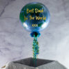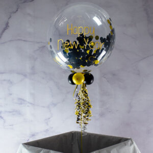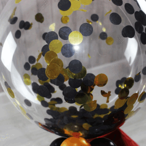 If you’re looking for an upmarket look then there isn’t much better than this beautiful 20″ bubble balloon! We fill this long lasting balloon with black and metallic gold confetti circles, creating a truly glamorous look that’s perfect for Hollywood or Art Deco themed parties. To finish we add four small balloons around the base and one of our black and gold sewn tails. Personalise the balloon with your own text and we will deliver it on a date of your choice, chosen during checkout.