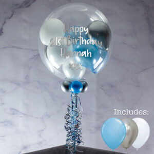 Create your very own winter wonderland with the Personalised Ice Blue Balloon-Filled Bubble Balloon from Party On! A perfect choice for Christmas parties, festive get-togethers and winter or ice-themed celebrations, it comes with three light blue, three chrome silver, and three snowy white balloons to decorate any venue in the colder months. You can also personalise this unique piece of decor with special wording of your choice to give as a gift or to add an individual touch to your party. Our 20″ clear outer balloon is inflated, then filled with smaller balloons in various wintry colours. On the outside you can add your message, with a choice of colours and fonts. Lasting 7 – 10 days on average, this bubble balloon arrives in a box, inflated and ready to open.