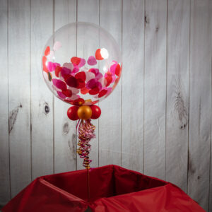 Our Personalised Large Hearts Confetti Valentine’s Day Bubble Balloon is an elegant and colourful decoration that would make the perfect gift for Valentine’s Day, anniversaries or even a proposal. A stunning bubble balloon filled with large heart-shaped confetti, your special someone is guaranteed to be surprised and delighted when this pops out of the box. You can even personalise this balloon with a message, font and colour of your choice. We inflate this balloon in a box, fill it with your choice of confetti, and then add your special message to the balloon’s outer surface so you can let the recipient know just how much you love them. To finish we add four small balloons to the base, along with ribbons and a weight. Lasting 7 – 10 days on average, it will arrive boxed and ready to open.