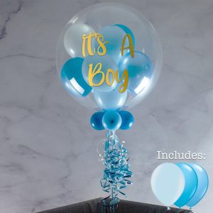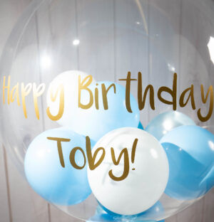 With a light blue colour scheme, this balloon-filled bubble balloon is perfect for baby showers, christenings, gender reveal parties, birthdays and more. We inflate a 20″ clear balloon and then insert a selection of small balloons inside, in various shades of light blue. On the outside, you can add your own wording or message in a choice of fonts and colours, or you can leave it blank. To finish, we add a collar of smaller balloons, ribbons and a weight. Lasting between 7 – 10 days on average, they’ll last long after the special occasion has finished.