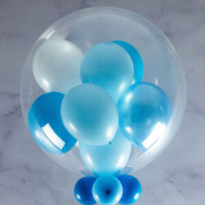 With a light blue colour scheme, this multi fill bubble balloon is a lovely gift to give on Father’s Day. We inflate a 20″ clear balloon and then insert a selection of small balloons inside, in various shades of light blue. On the outside, you can add your own wording or message in a choice of fonts and colours, or you can leave it blank. To finish, we add a collar of smaller balloons, ribbons and a weight. With a float time, on average, of 2 – 4 weeks, this is a lasting gift for any Dad.