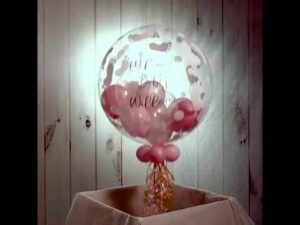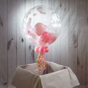This personalised light pink baby feet print bubble balloon is perfect if you’re celebrating the arrival of a newborn, throwing a gender reveal, baby shower or first birthday party or celebrating a Christening! You can customise this cute gesture with a special message, font and colour scheme to completely make it your own. To create this adorable decoration, we inflate a 24″ outer balloon, printed with a baby feet design, before filling it with mini pink balloons to complete the unique design. We then add ribbons and tie a weight to the bottom as a finishing touch. Lasting 7 – 10 days on average, this bubble balloon arrives boxed, inflated and ready to open.
