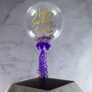 Give someone a truly special gift with this lilac feathers bubble balloon, which can be personalised with any message you choose. We simply inflate a clear 20″ outer balloon then fill it with purple feathers to create a stunning effect. On the outside we add your chosen wording in a choice of beautiful fonts and colours, making this balloon suitable for any occasion. To add that finishing touch, we add four matching balloons to the base, along with ribbons and a weight. We expect these balloons to last 7 – 10 days, making a lasting and thoughtful gift.