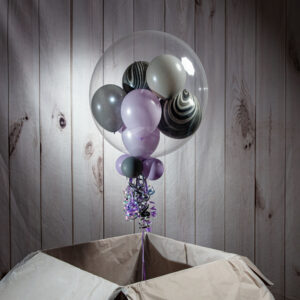 Featuring a striking and completely unique marbelised design, this Personalised Lilac Swirl Balloon-Filled Bubble Balloon is great for adding some flair and colour to any party, special occasion or important milestone. Comes with a design that can be fully customised with your own wording with grey and marbelised black & white mini balloons inside the clear outer layer. To create this decoration we inflate a 24″ outer balloon, printed with your own message, and fill it will a selection of lilac, grey and swirl print mini balloons. To finish off the look we add coloured ribbon and a weight to match! Lasting 7 – 10 days on average, this bubble balloon arrives in a box, inflated and ready to open.