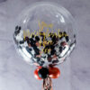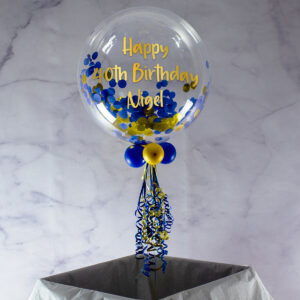 One of our smartest and most sophisticated confetti bubble balloons, this navy and gold design is perfect for more formal occasions and parties. We inflate a clear 20″ outer balloon and then fill it with navy blue and gold confetti, while on the outside we add a personal message of your choice. To complete the look, we add four small balloons to the base, along with ribbons and a weight.