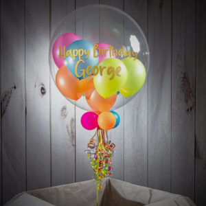 Set the scene for a disco, festival or 80s themed party with our vibrant personalised neon balloon-filled bubble balloon from Party On! Versatile enough to decorate any venue or tailor to your special occasion theme, this decoration can be customised with your own wording and comes in non-reactive neon shades. A clear 20″ outer balloon provides the perfect exterior for the nine smaller colourful balloons to shine, with space on the outside for your own wording or message. To complete this look, we add four smaller matching balloons to the base, along with matching ribbons and a weight. Our balloons have an approximate float time of around 2 – 3 weeks.