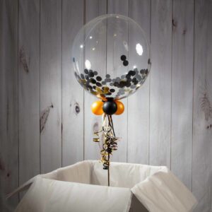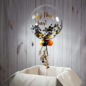 If you’re looking for an upmarket look for your New Year’s Eve party then there isn’t much better than this beautiful 20″ bubble balloon! We fill it with black and metallic gold confetti circles, creating a truly glamorous look that’s perfect for Hollywood or Art Deco themed parties. To finish we add four small balloons around the base and one of our black and gold sewn tails. Personalise the balloon with your own text and we will deliver it on a date of your choice, ready for your big bash!
