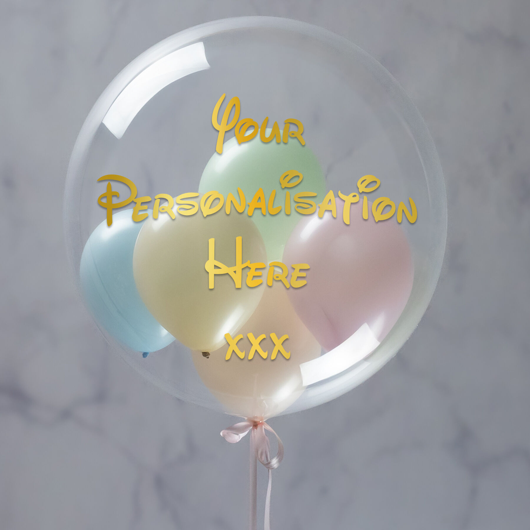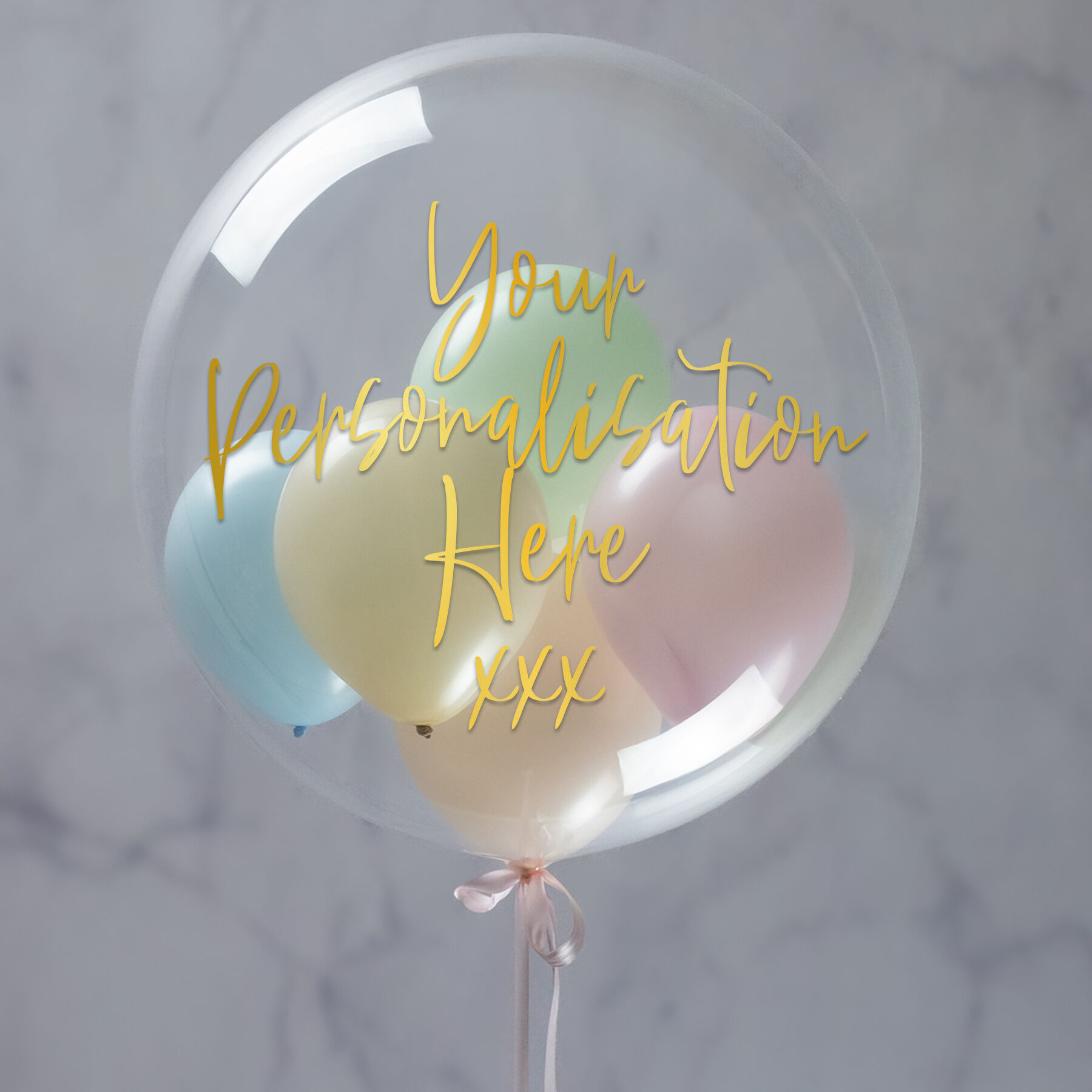 The Personalised Pastel Balloon-Filled Bubble Balloon from Party On Balloons is a lovely decoration or gift for baby showers, christenings, birthday parties, pastel-themed events and more. This bubble balloon features a range of personalisation options, allowing you to add a special message, font and font colour of your choice to really make it your own and so you can create a wonderful impression for a friend or family member you love. Inside the 20″ clear outer balloon, we inflate a selection of small balloons in various pastel shades to create a lovely effect. On the outside, we can add your own wording or message in a choice of styles and colours. To finish, satin ribbon and a weight. This personalised balloon has a float time of 7-10 days but usually longer if kept in a nice warm space away from sharp objects, inquisitive pets and heat sources.