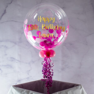 Our confetti filled bubble balloons are the gift or decoration for any occasion, sent fully inflated on a guaranteed next day delivery service. Each 20″ clear balloon is filled with shades of pink paper confetti, making it look simply stunning when it’s let out of the box. You can personalise your balloon with any message on the outside – just choose your required font and colour. We finish each balloon with four smaller balloons at the base, and matching ribbons and a weight. They will last approx 2 – 4 weeks.