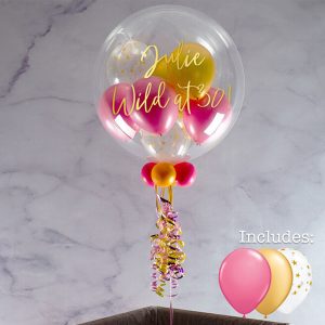 Pink and gold is a classic combination, making this balloon a stunning decoration for weddings, birthdays and other special occasions. The huge 20″ clear outer balloon is just the start – inside we inflate a selection of small balloons in pink and gold shades. On the outside of the balloon, we can add your own wording or message for that big event. To finish it all off, we add four small balloons to the base, matching ribbons and a weight.