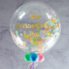 One of our most glamorous and eye-catching balloons, this rose gold glamour design is perfect for birthdays, anniversaries and special celebrations. It’s a lovely gift for a special occasion and also looks great when decorating a party venue or event. We inflate a clear 20″ balloon, then fill the inside with rose gold, black, white and clear stars smaller balloons to create a stunning effect. On the outside we can your own personal message, and we finish it with a collar of smaller balloons, ribbon and a weight. On average our balloons last for between 7 – 10 days.