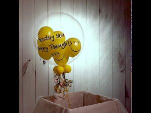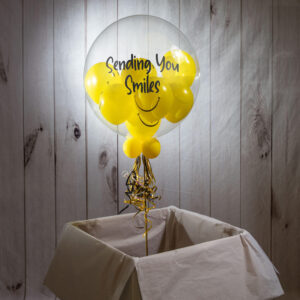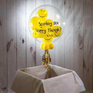 Our delightfully happy Smiley Faces Bubble Balloon is perfect for sending someone a smile. Perfect for cheering up a friend or family member, this bubble balloon will bring a smile to their face and let them know you are thinking of them. We inflate a 20″ spherical clear plastic balloon and then insert 9 bright yellow smiley face balloons inside. To finish we add 4 small balloons to the base of the balloon and add colour co-ordinated ribbons and weight. Typically lasting between 7 – 10 days, they’re a great, long-lasting gift. Once deflated they can be folded up to use in a memory box. Please note, the balloon will only read with the message you add into the personalisation field.